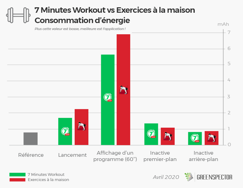 Sur un scénario d’utilisation de 1 minute, la consommation énergétique de 7 Minutes Workout est équivalente à une application de messagerie instantanée telle que Line. Quant à Exercices à la maison, sa consommation est similaire à une application telle qu’un réseau social tel que Facebook Lite. (Source : Étude sur la consommation énergétique des 30 applications les plus populaires au monde).
