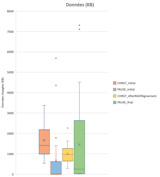 La médiane des données chargées des sites est à 1,3MB (bleu foncé). Ensuite, pour la plupart des sites, l’inactivité n’implique que très peu de données (en orange) ; c’est ce que l’on attend car aucun service ne doit être lancé. On observe cependant certaines “anomalies” (les points au-dessus des moustaches). Il s’agit généralement de vidéos qui sont lancées automatiquement. Ceci est potentiellement une anomalie d’un point de vue RGPD et d’un point de vue sobriété (La lecture automatique des contenus n’est pas recommandée). Cependant, on peut aussi imaginer que le service vidéo qui se lance n’utilise pas de données personnelles et le fera ou non à la suite de la validation.