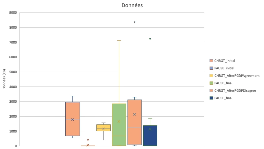 Concernant les données, le refus du consentement amène encore beaucoup de données, parfois autant que l’acceptation (gris versus bleu ciel). La consommation en inactivité est légèrement plus faible.