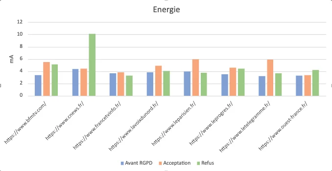 La consommation d’énergie est légèrement plus importante au chargement suite à la validation des cookies. Ceci est principalement lié au chargement des librairies autorisées avec les cookies et d’autre part à des repaints et reflows de la page suite à ces chargements. Ceci dit, le contenu utile (photo, texte) est généralement chargé initialement, le coût du consentement amène, en termes d’énergie, à un équivalent de deuxième chargement.