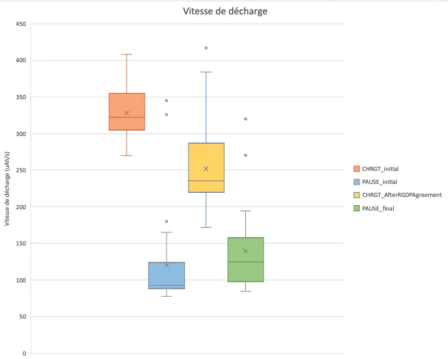 Concernant l’énergie, nous allons observer deux métriques : l’énergie totale consommée sur l’étape et la vitesse de décharge de l’étape.