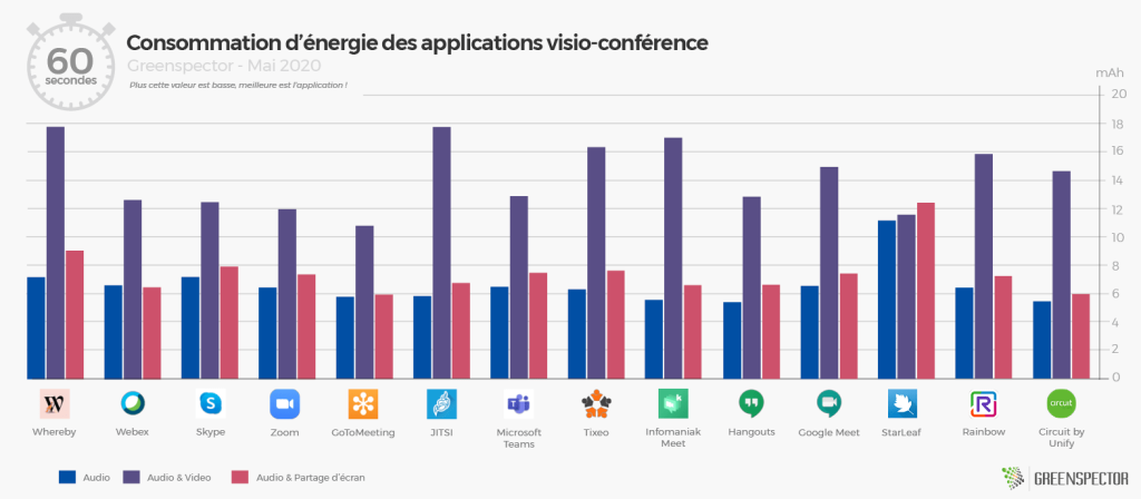 La consommation en énergie de l’ensemble de ces applications est en moyenne 2,1 fois plus importante quand on ajoute la vidéo à l’audio et à peine supérieure quand on ajoute le partage d’écran à l’audio (+14%). Ce n’est pas une surprise, évitez le partage avec caméra pour moins consommer d’énergie sur vos devices lors de vos visioconférences et économiser votre autonomie et la durée de vie de votre batterie !